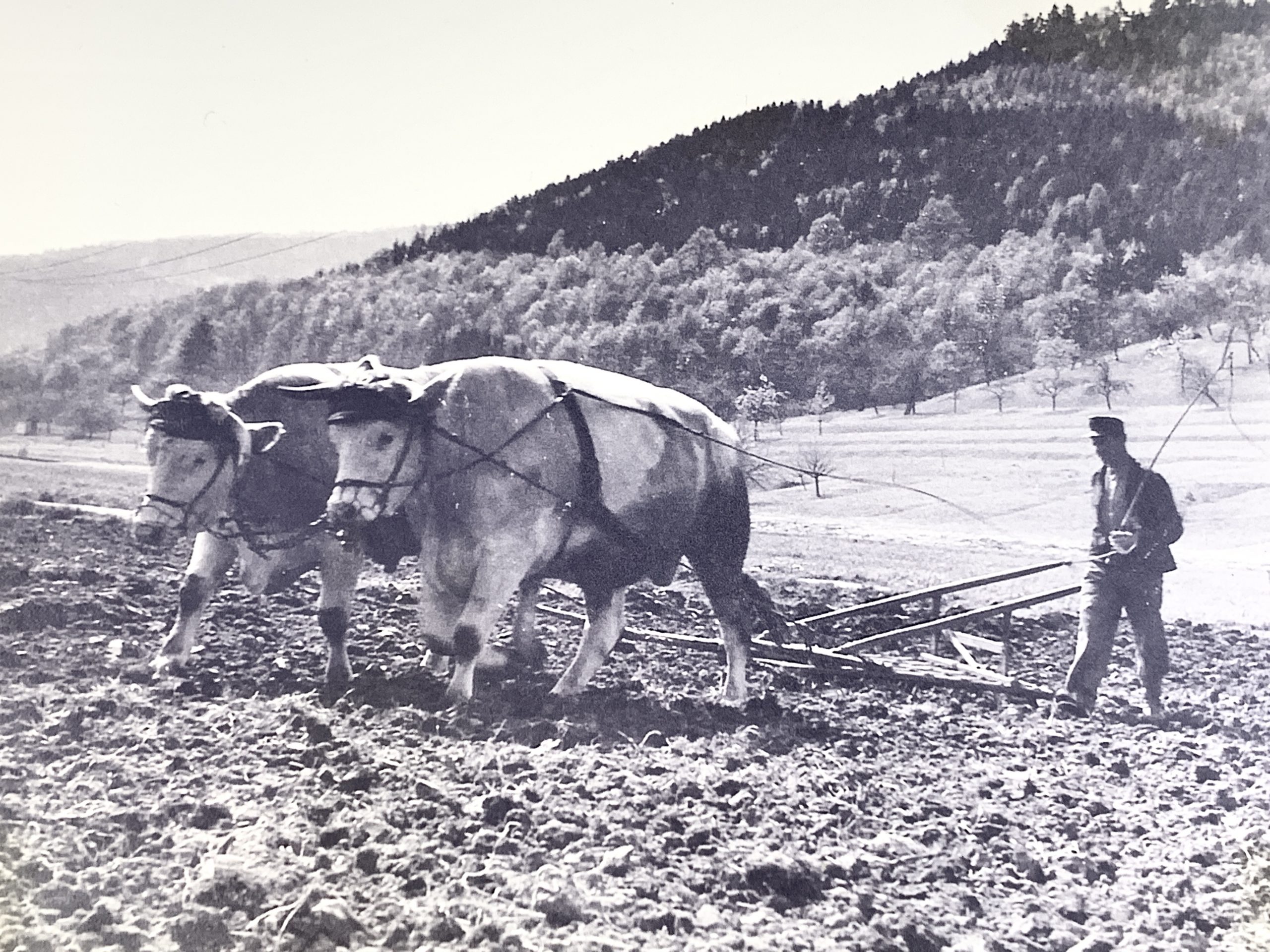 Auf dem Foto, mein Schwiegervater Eugen mit seinen Ochsen, mit denen er gesprochen hat und die ihm aufs Wort folgten. Wie viele heute Sonntags ihren Hund ausführen, ging er mit seinen beiden Ochsen über Wiese und Wald spazieren. Er arbeitete als typischer, schwäbischer Kleinbauer mit einigen Äckerle, den Ochsen und fünf Kühen. Das reichte zum Leben kaum, weshalb er für die Gemeinde noch nebenher im Wald schaffte.
