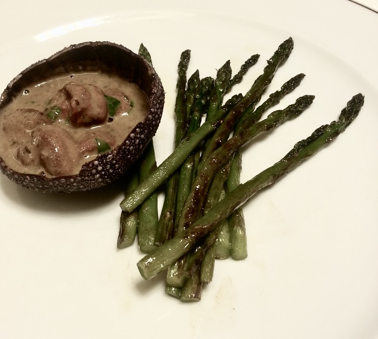 Letzte Woche war es Seeigel, diese Woche nicht. Das hängt immer davon ab, ob man beste Ware bekommt oder nicht. Diesbezüglich muss man streng sein. Letzte Woche hatten wir auch gepökelte Kalbszunge in Madeirasauce. So geht das mit mir seit 56 Jahren, das ist mein Leben und es ist gut so, das hält in Schwung.