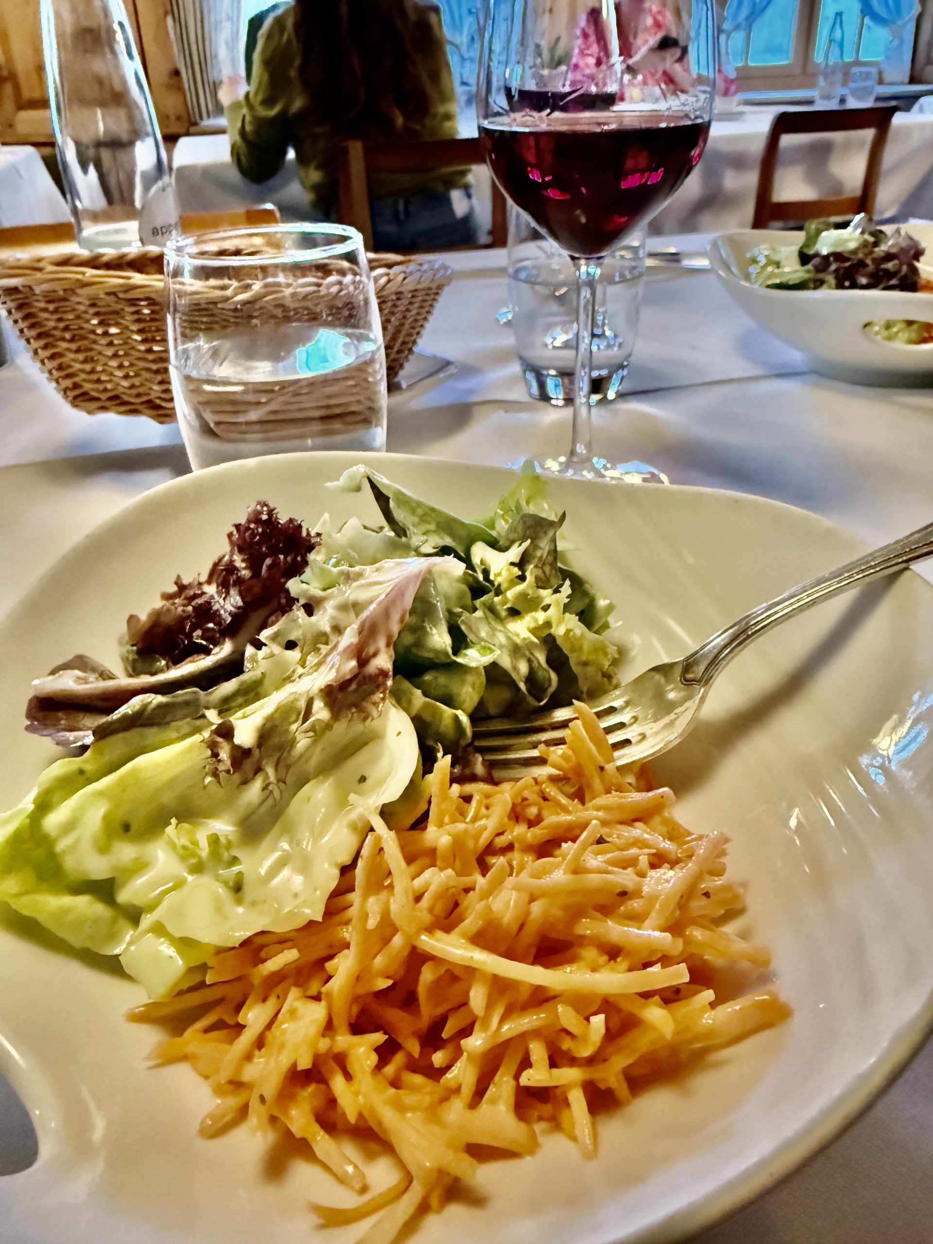 Im letzten Herbst saß ich bei Paul Bocuse am Tisch, auch ein Ort kulinarischer Herrlichkeit. Es wird immer noch so weltklasse gekocht, als sei der Maître nicht verstorben. Zu seinen Lebzeiten haben die gleichen Leute gekocht. Bocuse ist mir eine Richtschnur. In Einrichtung und Flair kann das weltberühmte Bocuserestaurant gegen das “Schiff” in Mammern nicht mithalten. Bei Familie Meier gibt es keine aufgebretzelten Millionärscessoirs, sondern Handwerkskunst in Holz und poliertem Messing zu erleben. In Mammern geriet ich in Seligkeit. Eigentlich noch mehr, denn es rührt mich geradezu, in einem Gasthaus zu sitzen in dem ein Geist wurzelechter Logik herrscht. In Deutschland, auch in Frankreich wird ständig renoviert, aber eigentlich müsste man von Zerstörung reden. Den dummen Wirten und Bauern wurde von Antiquitätenhändlern eingeredet, dass ein alte Eichentisch überhaupt nicht so modern sei wie ein Resopaltisch. Das Wort “Neu” ist für mich das Ungückswort schlechthin. Mit “Neu” glaubt jeder an etwas Besseres. Nichts gegen Neu, wenn es gut altert, und das ist nicht mehr oft zu haben. “Neu” ist oft rasant schnell alt und wird dann weggeworfen. In Mammern ist alles Qualität, es gibt es keine modische Crossoverküche oder irgendwelche Kombu-und Sojabrühen. Wieso auch, wenn es alte Gerichte gibt, die besser sind. Schweizer Klassiker kommen auf den Tisch. Leberli oder Zürcher Geschnetzeltes mit Rösti, und für mich war es die “Forelle Blau”. Sie hatte den einmaligen Geschmack und keinerlei Gewürz irritierte. Der Fisch, aus reiner Natur stammend schmeckte nach reiner Natur. So etwas ist für mich nahezu ein kulinarisches Wunder. Etwas richtig Neu- und Seltenes kam auch auf den Tisch, nämlich ein Kopf- und Karottensalat ohne Gerümpel obenauf, ohne Kürbiskerne, die beschissen schmeckenden Sprossen, ranzige Nüsse, blaue Kartoffelchips, kurzum eine Müllhalde des Schreckens. Dies gibt es überall, nur um davon abzulenken, dass der Kopfsalat nach Kunstdünger schmeckt oder sonswie so schlapp ist, dass man ihn verstecken muss.