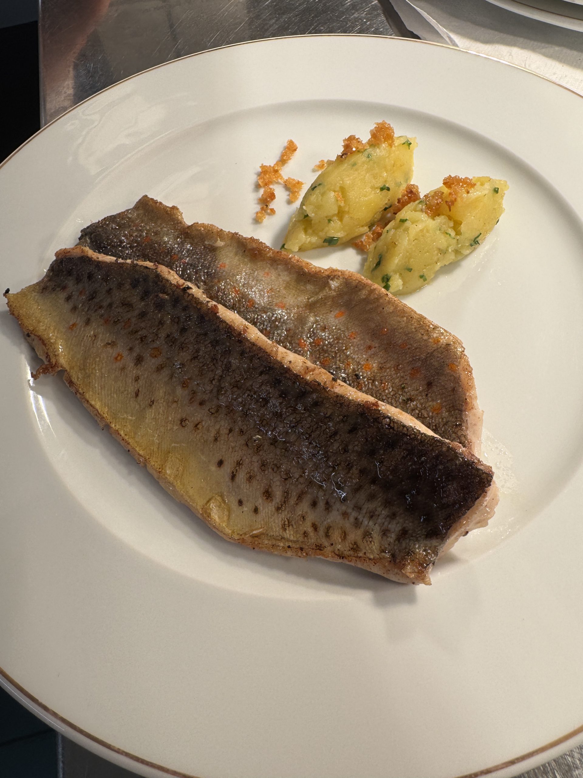 Aus Hamburg bekommen wir von einem kleinen Fischkutter immer wieder den Tagesfang. Die Fischer schmeissen alles in eine Super-Isolierkiste und schicken diese uns per Übernachtfracht. Das kostet einen Haufen Porto. Ich will gar nicht wissen wieviel, ich glaube es sind neunzig Euro. Wir wissen nie was drin ist. Diesmal waren es kleiner Steinbutte und ein Flunder war dabei. Den Flunder habe ich selbst vor den Gästen zerlegt, denn er ist sehr weich und heikel.