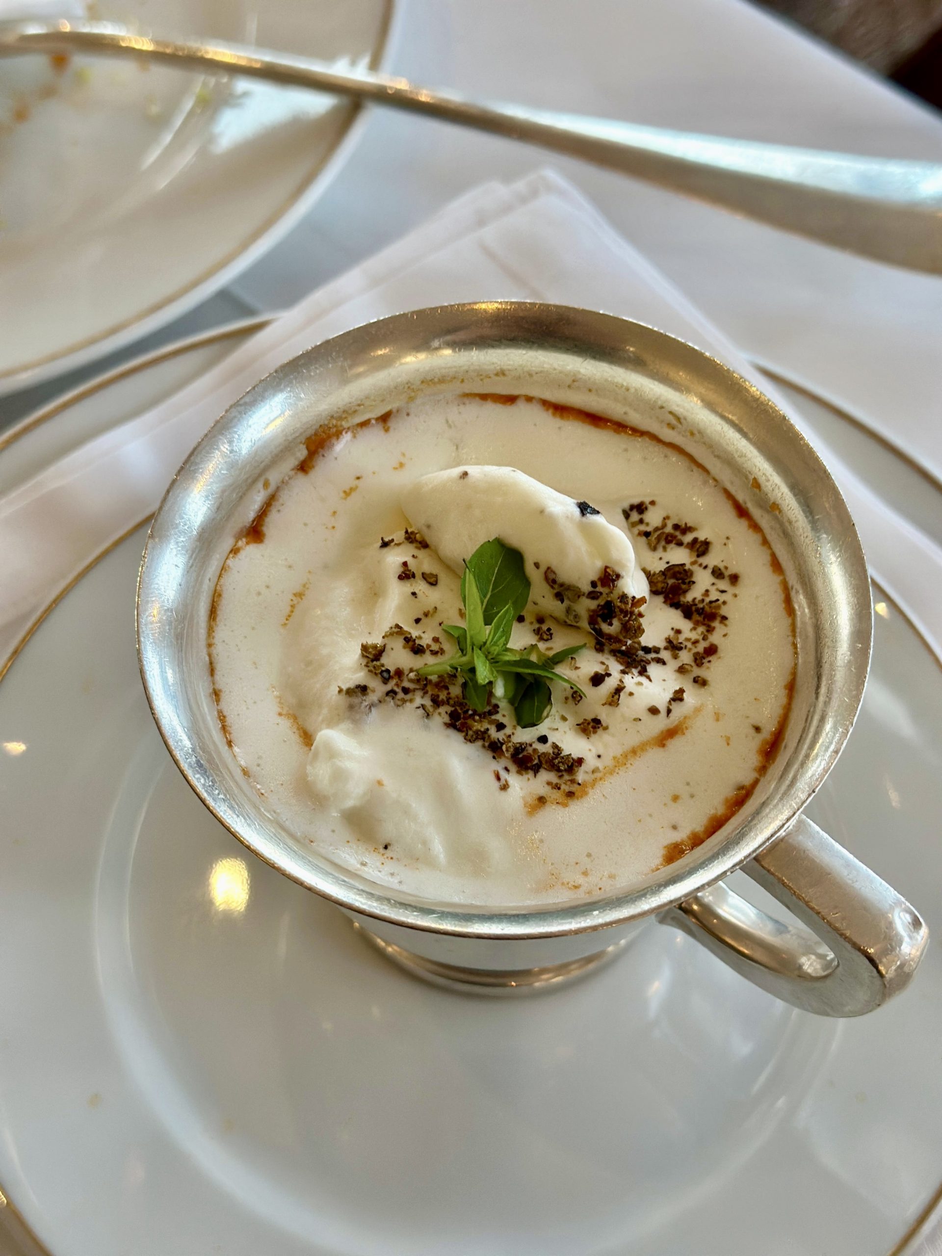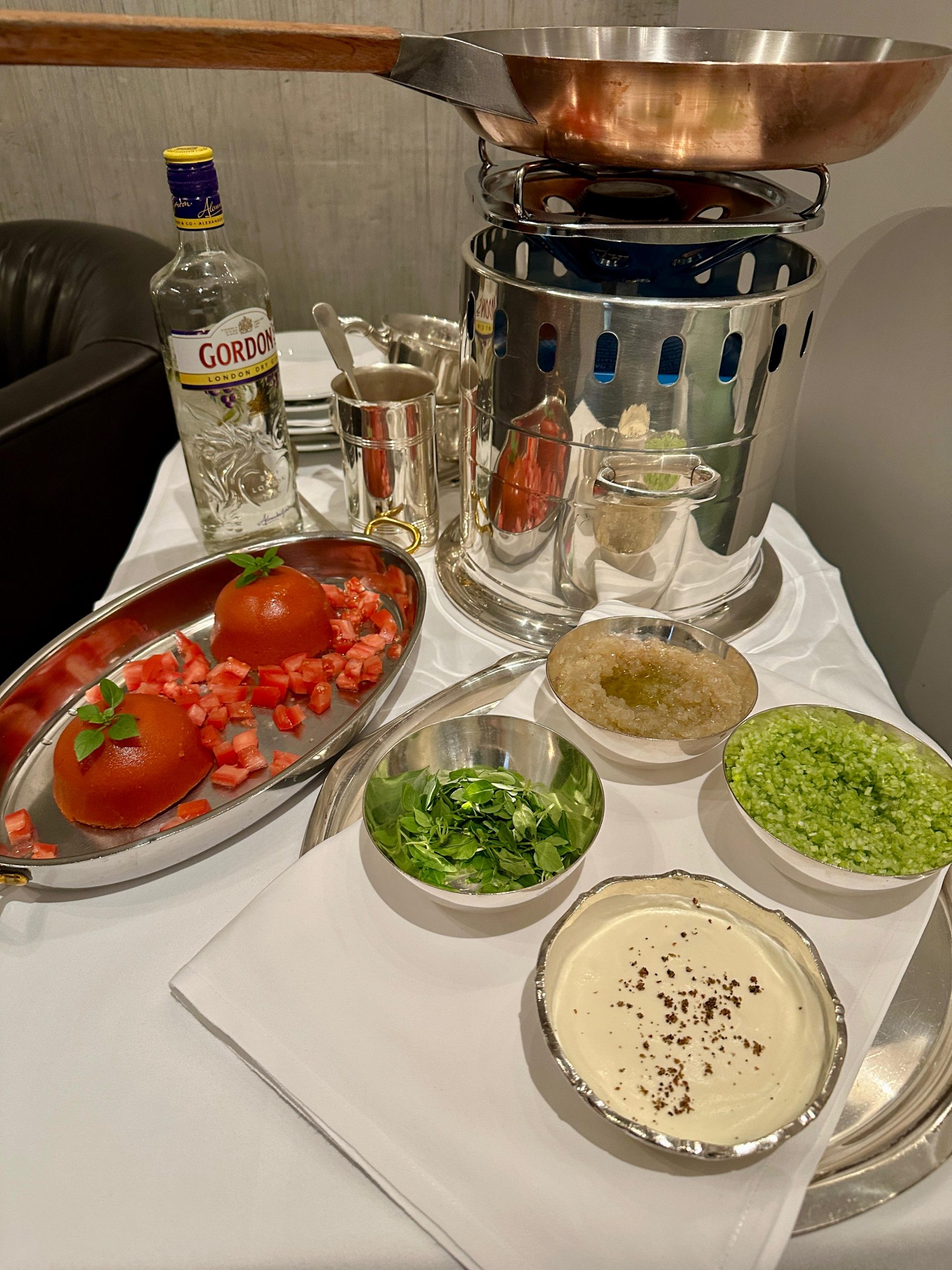 Gehackte Tomaten, frischer Tomatensaft und so weiter mit etwas Gelatine versetzen und in eine Tasse gießen und gelieren lassen. Die Tassen wurden dann auf ein Teller gestürzt und obenauf ein Basilikumbäumchen. Am Tisch werden Schalotten und Lauchwürfelchen in Olivenöl gedünstet. Das Rezept für zwei Personen, die Tomatenkugeln werden zu den Schalotten und zum Lauch gegeben die in der Hitze zu schmelzen. Gordons Gin dazu. Die Suppe fängt Feuer und wird mit Ginsahne mit etwas Wacholder serviert.