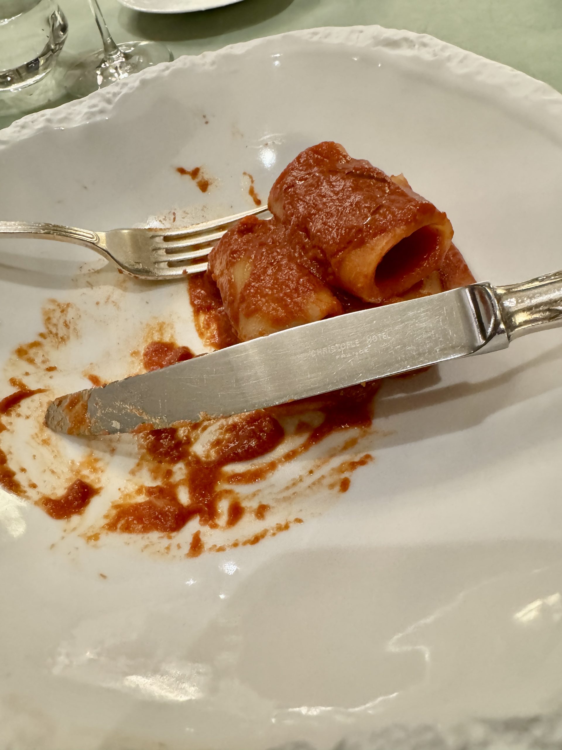 - 6 Canneloni, nicht al dente sondern innen roh+steinhart. In Tomatenpampe gewendet, 60 €. Begründet werden die Preise weil der Kellner dazu eine Heilige Messe liest.