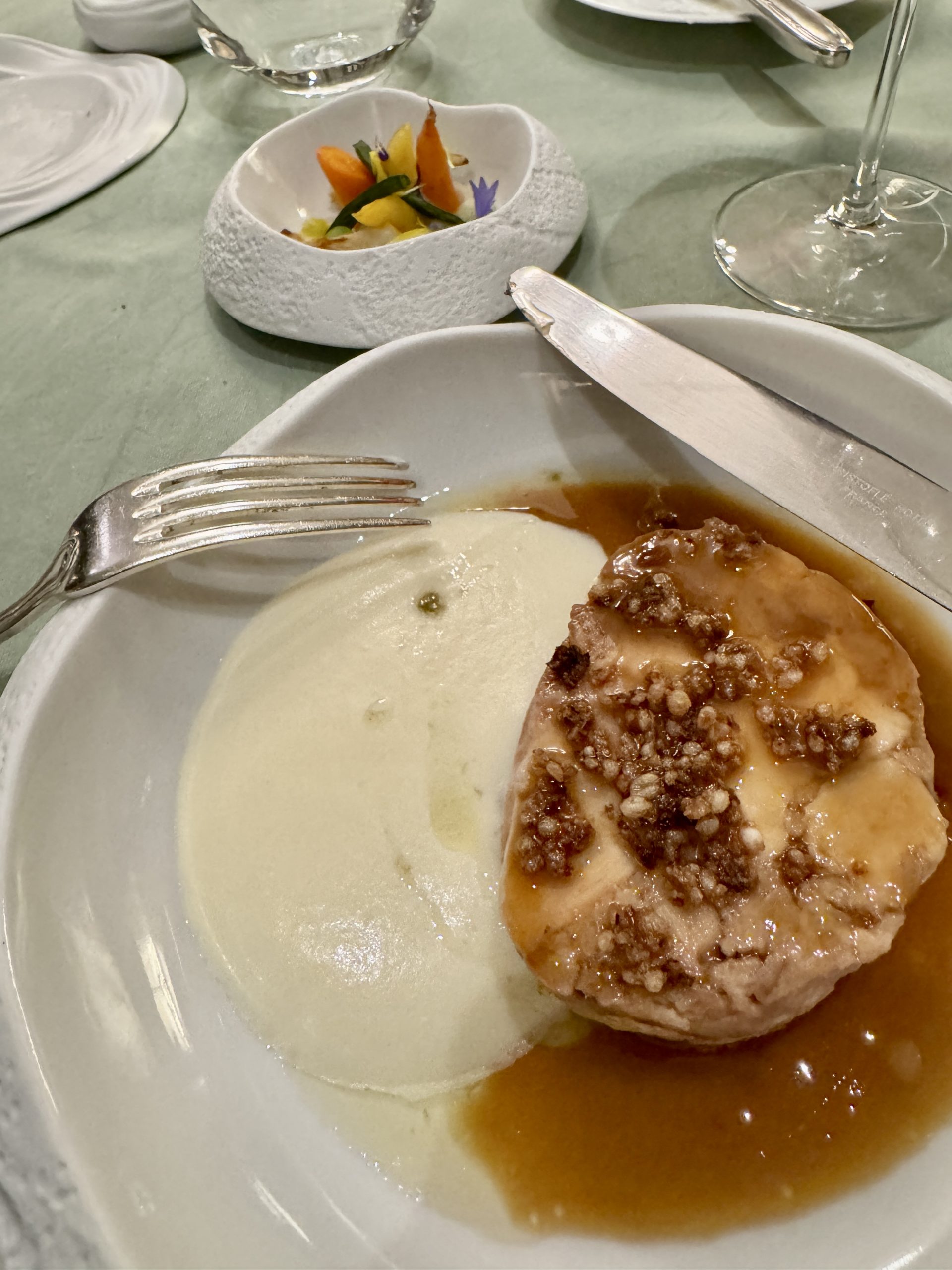 - 80 €. Sous-Vide Hahn geschmacklos, amorph für Zahnlose. Kartoffelpüree aus der Sprayflasche. Man achte auf das Witzgemüse. Mit der harten Karotte habe ich mir die Lippe aufgeritzt.