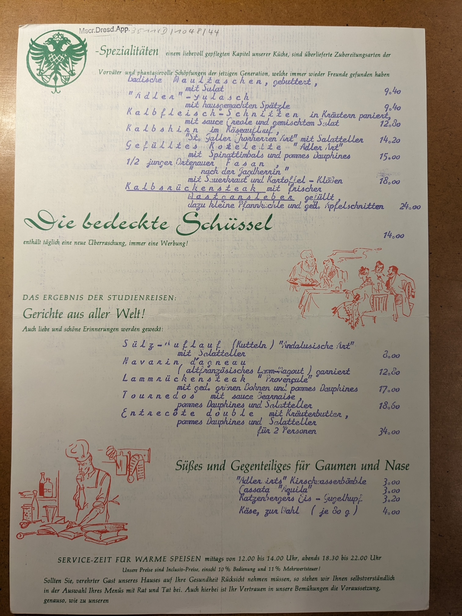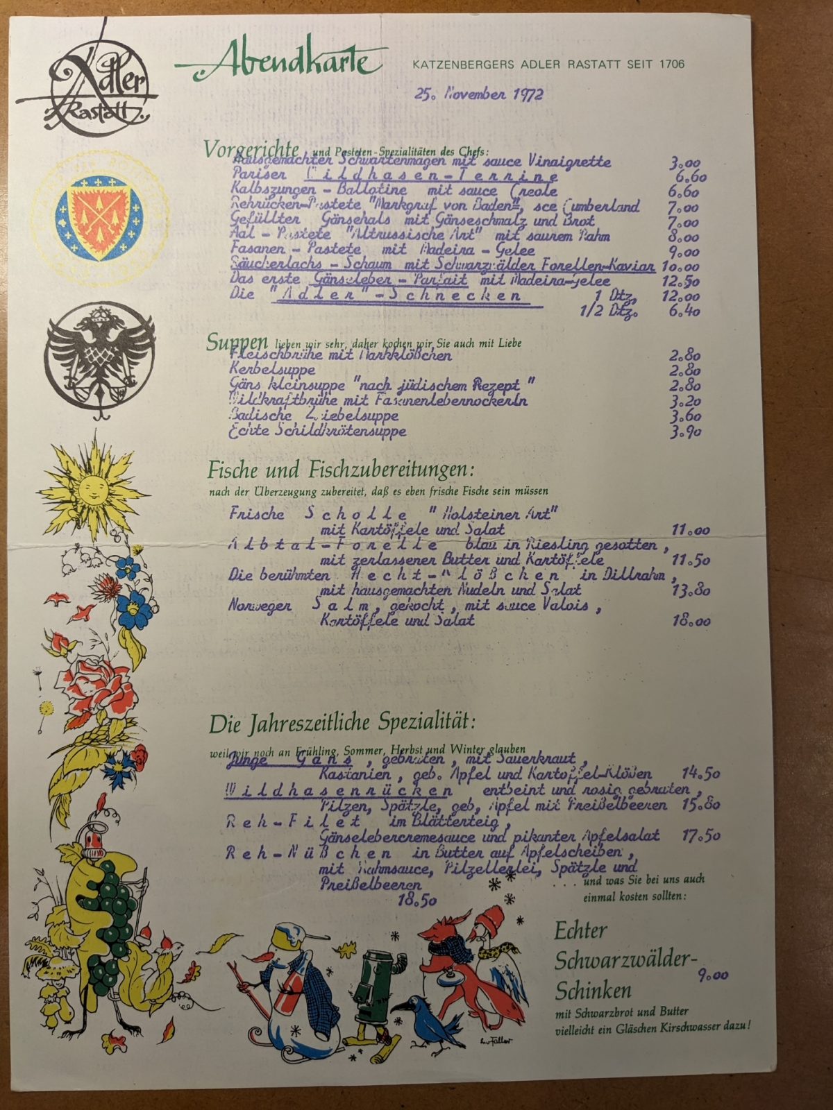 Katzenbergers Adler in Rastatt. Wir kochten wie die Teufel. Schauen Sie sich die Preise an. Das nennt man Inflation. Uns mag das sehr billig erscheinen, aber der Adler war einer der teuersten Restaurants in Baden Württemberg. Viel Konkurrrenz gab es nicht. Das waren gerade mal die Alte Post in Stuttgart, der Erbprinz in Ettlingen und die Kleber Post in Saulgau. Nicht zu vergessen die Sonne-Post in Murrhard.