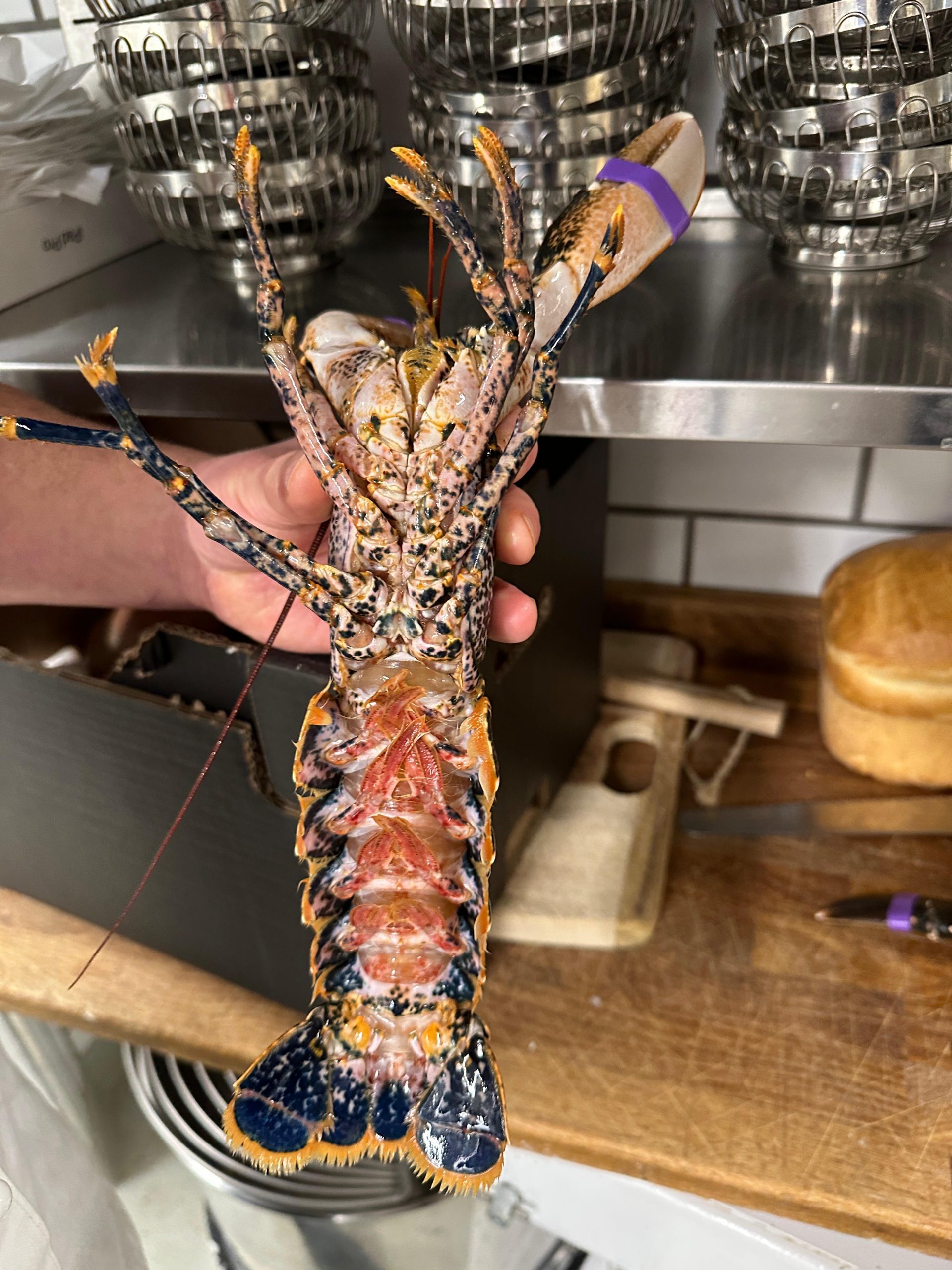Es gibt den blauen europäischen Hummer, und der ist etwas Besonderes. Eine kleine, edle Unterart ist auch der “Helgoländer Hummer”, der geschützt werden muss, da er fast ausgestorbern war. Kurz nach dem Krieg kam es zur “Operation Big Bang”. Die Engländer wollten Helgoland im Meer versinken lassen. Am 18. April 1947 wurden ungefähr 7000 Tonnen Sprengstoff, Bomben und sonstige Munition über Helgoland abgeworfen. Die Insel hielt schwer demoliert stand. Das gesamte Leben des umliegenden Meers aber war komplett vernichtet. Nach einigen Jahrzehnten entdeckte man dann einige überlebende Hummer des Massakers und stellte sie unter Schutz. Es gibt auf Helgoland einen einzigen zertifizierten Hummerfischer und Naturschützer, der umfassende Auflagen berücksichtigen muss. Immer wieder bekommen wir geringe Mengen. Für Vorspeisen sind sie nicht geeignet, denn es werden nur ausgewachsen gehandelt, diese sind riesig bis zu 50 cm lang und drei Kilo schwer.