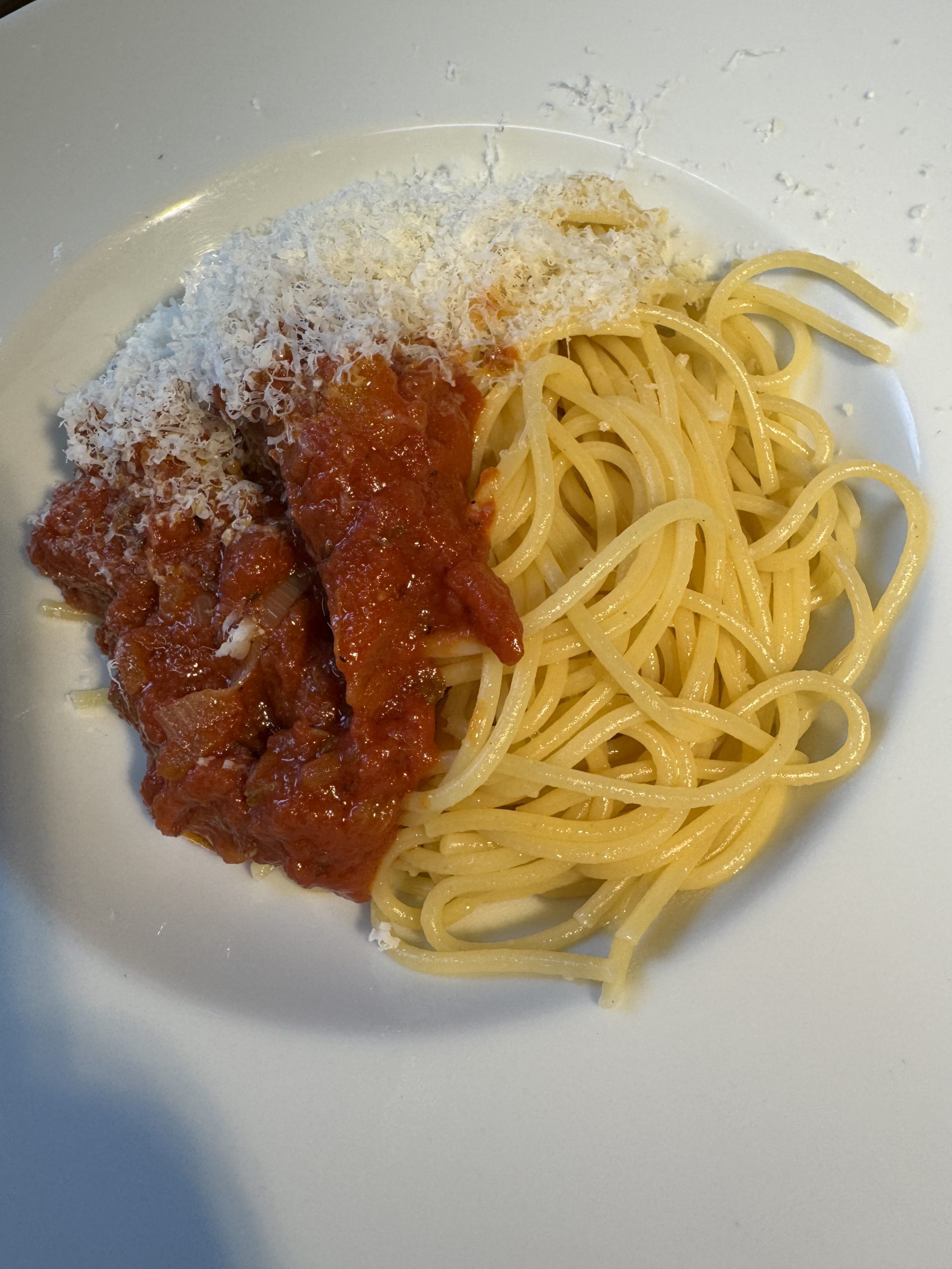 Weichweizen Nudeln obenauf, sehr weich, ich wusste gar nicht mehr, dass es DDR-Style-Nudeln noch gibt. Allenthalben hat man heute Harteizennudeln. Nudelmampf dienten als Fundament des Italienischen Gerichts. Gefüllter Suppenteller zur Hälfte. Darüber lagerte ein Mischmasch, von Paprika, Tomatenmark, und Zucchiniwürfel. Der Batz erinnerte an kleingeschnittenes, oft aufgewärmtes Ratatouille mit einigen kaum erkennbaren Fleischfitzeln. Das Ganze war essbar, sah aber aus wie ein Scheißhaufen und schmeckt nicht besonders gut. Das Ganze nannte sich Pasta mit Ossobuco.
