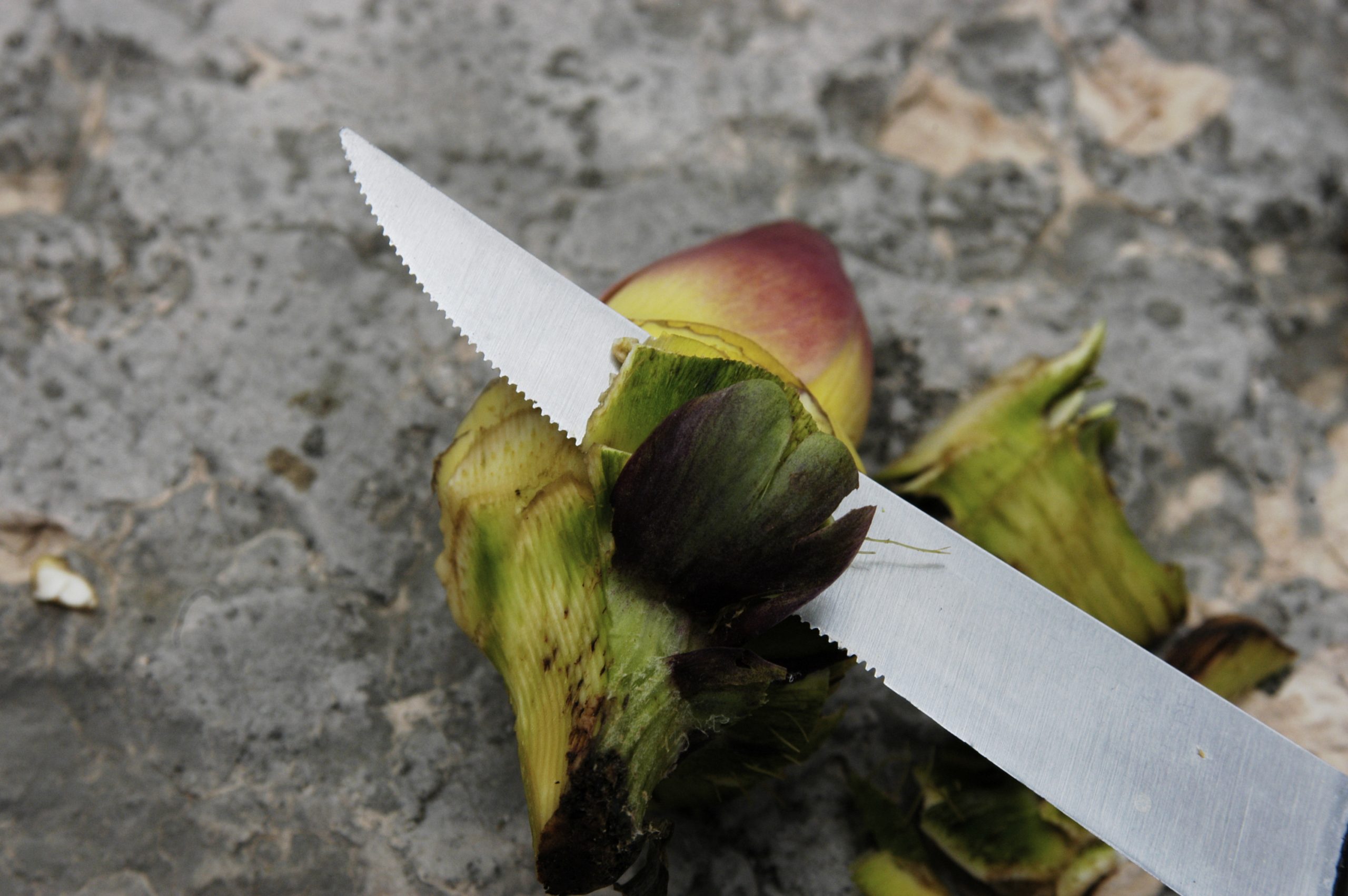 Sie werden schnell braun, es muss schnell gehen. Die Blätter nach unten abbrechen. Anschließend geht es weiter mit dem Messer. Danach schnell in kaltes Wasser mit Zitronensaft tauchen. Ich nehme lieber HAKO-Weiss, denn seit Jahren kämpfe ich dagegen, dass Artischocken meist mehr nach Zitrone als nach Artischocke schmecken.
